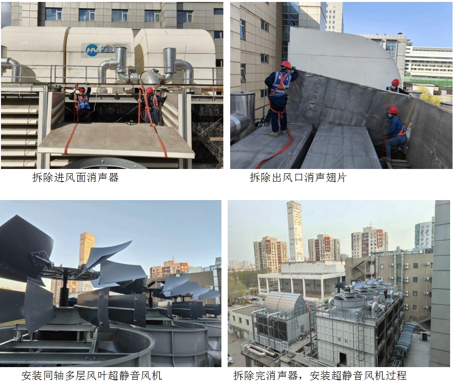 冷卻塔噪聲明顯來源于冷卻塔動力系統,將原有進出風口消聲器拆除,把冷卻塔原單葉輪的3353mm風機升級至同軸多層風葉超靜音風機,實現風機超低轉速下輸出冷卻塔所需風量。